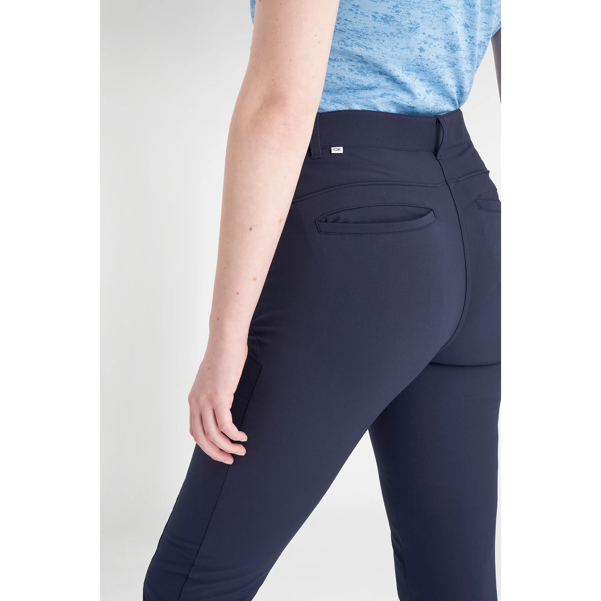 - CK signature woven tab stitched into back left waistband